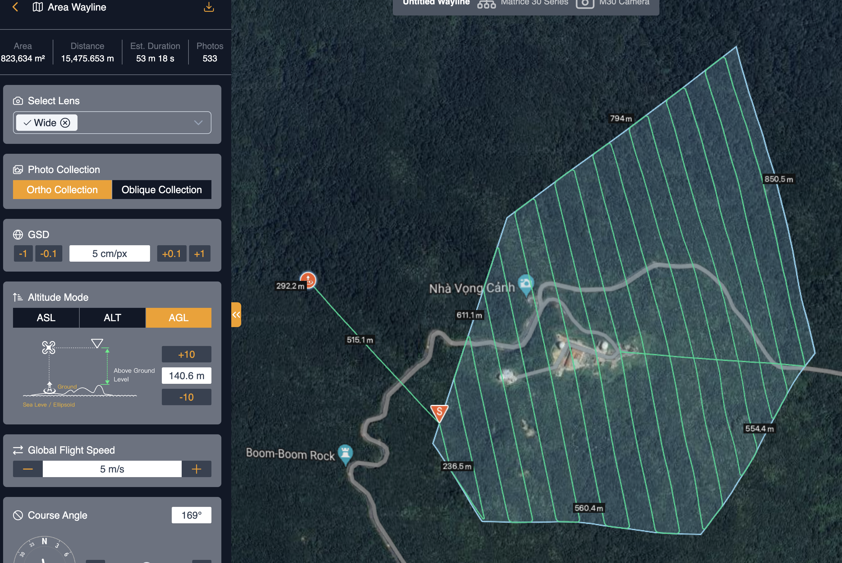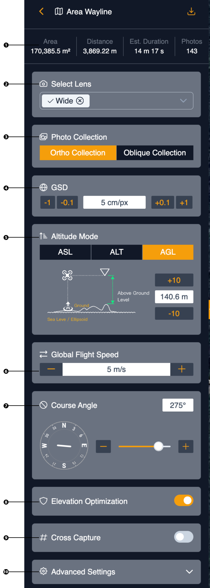 Allows users whether they want to enable the elevation optimization. If it’s enabled, the model output will have more details. Aircraft will fly to the center of the mapping area after completing the flight route and capture a series of tilt-angle photos to optimize its measurement of elevation. This option is only available for the Ortho Collection and will be disabled if the user enables the Custom Camera Angle option.