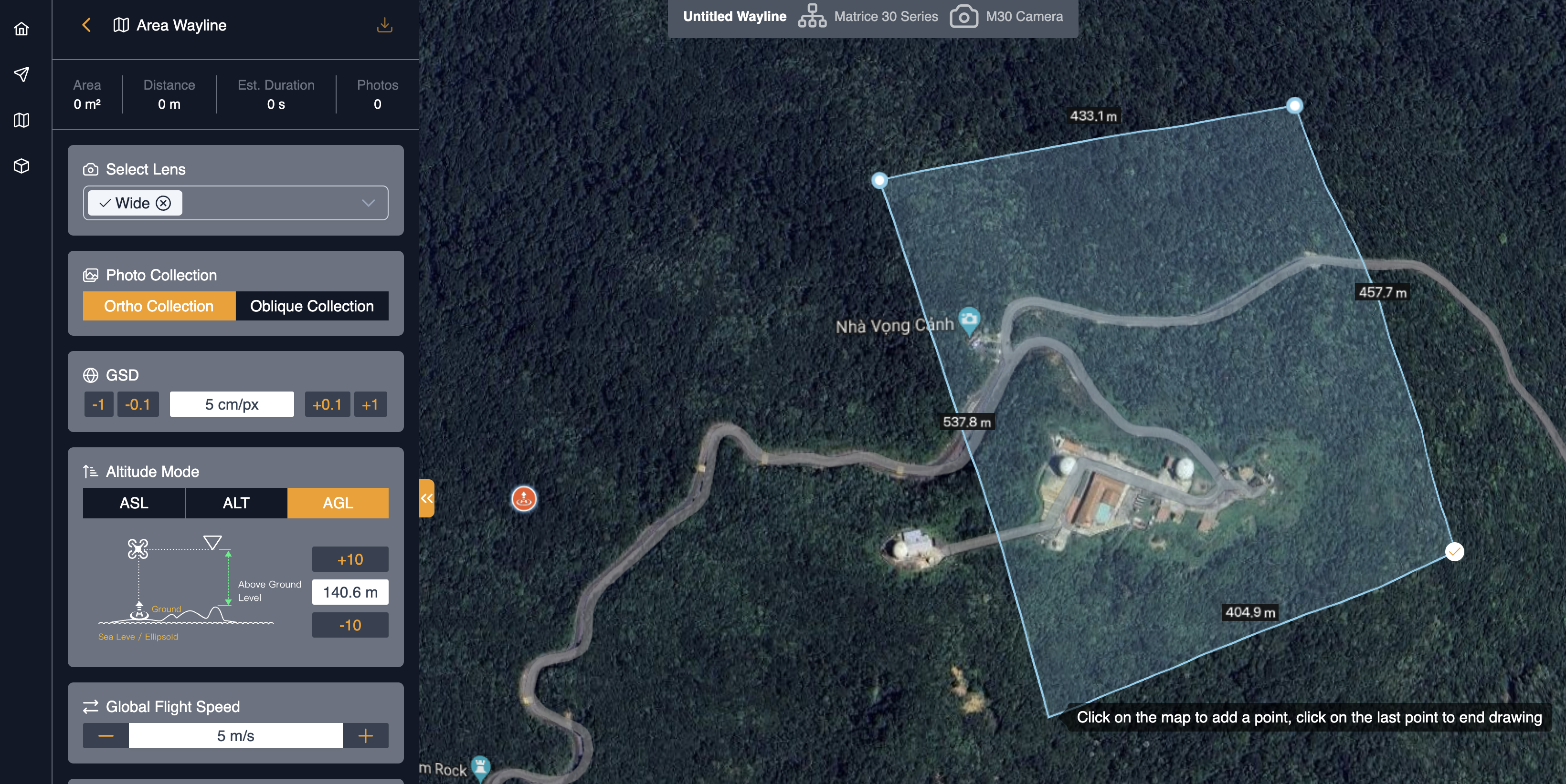 After adjusting the entire polygon, the system will readjust the terrain elevations and flight altitudes for all waypoints. Validation is necessary if there are any irregularities during dragging. If issues arise, such as kinks in the polygon, the material color will change to red, indicating that a wayline has not been successfully generated.